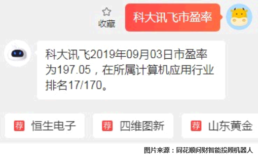 下图中,用户询问“科大讯飞市盈率”,机器人通过判断科大讯飞是一只A股的股票,然后给出了相同属性其它实体的推荐。