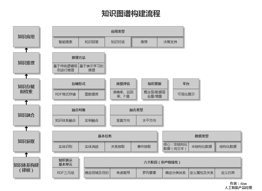 知识图谱的构建主要分为知识体系构建、知识获取、知识融合、知识存储和检索、知识推理、知识应用六个步骤。