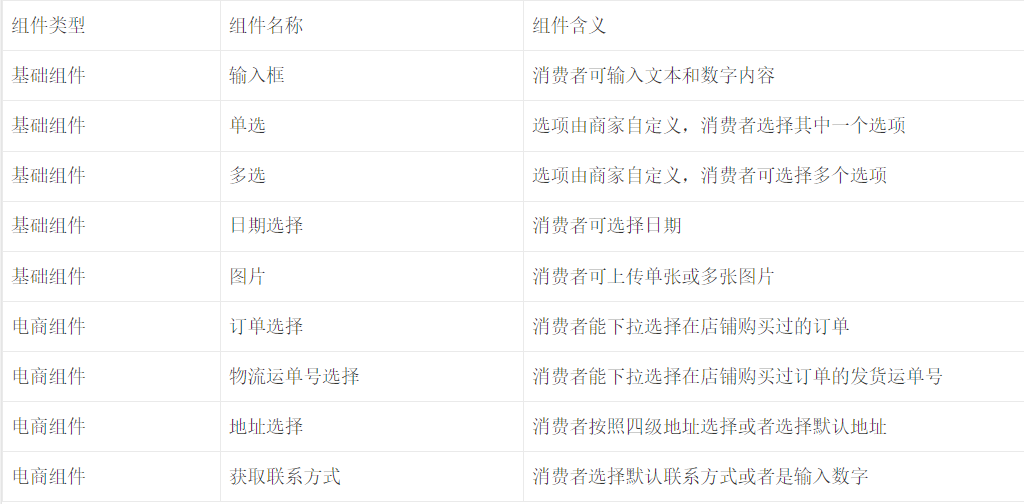 - 表单模板类型:表单归属于某一场景模板(比如退差价场景、物流催促场景等),归属后该表单会先配置了部分组件